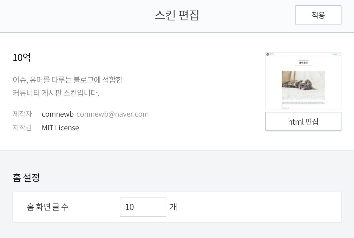 스킨 편집 대시보드에서 홈 설정 - 홈 화면 글 수에서 설정