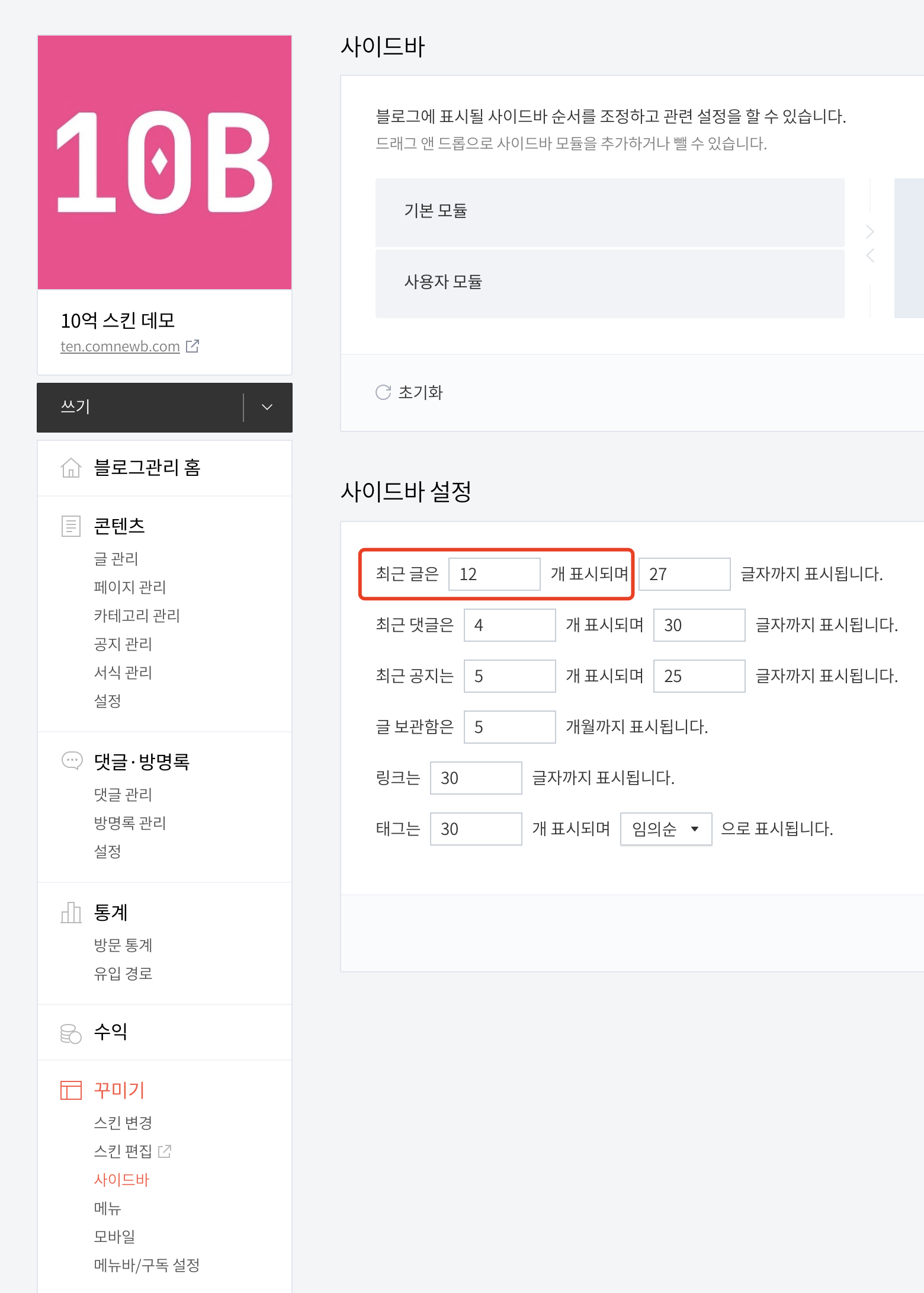 꾸미기 - 사이드바 - 사이드바 설정에서 최근 글 개수 설정