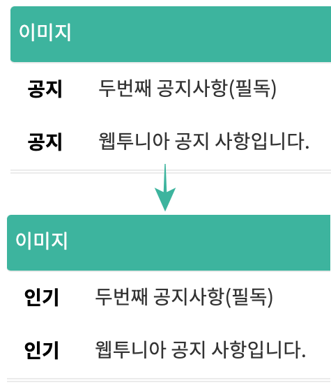 빈 칸인 경우 기본값으로 '공지'로 표시됩니다. 아래는 '인기'로 변경 후
