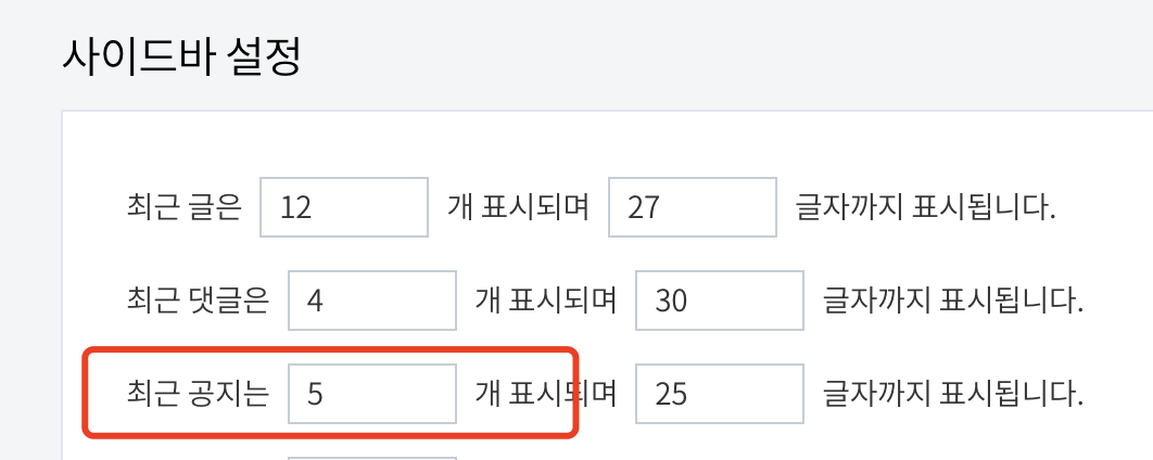 꾸미기 - 사이드바 - 사이드바 설정에서 최근 공지 개수 설정
